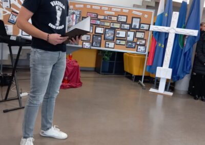 Program je otvorio učenik 4. a Borna Turkalj pročitavši pjesmu Tomislava Domovića Pismo poginulog ratnika. Pjevački zbor izveo je pjesmu Hrvoja Hegedušića Vukovar. Naposljetku se svim okupljenima obratila profesorica Tatjana Šimundić, inače rođena Vukovarka, koja nas je sve potaknula na poseban osjećaj zahvalnosti prema svim žrtvama bez kojih mi ne bismo uživali u današnjoj slobodi.